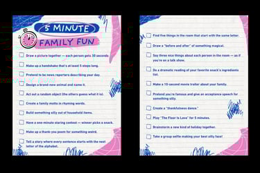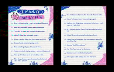 Short on time? Big on fun! Try one (or ten) of these quick challenges to spark giggles, creativity, and connection — no prep required. Perfect for school mornings, dinner breaks, or anytime you need a laugh.